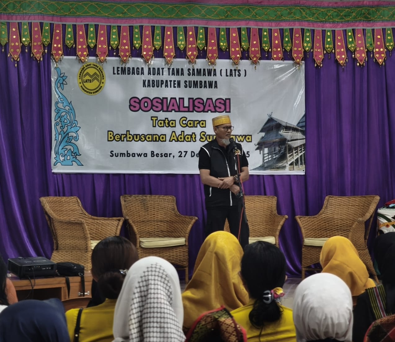 Pada agenda pertama, LATS mensosialisasikan pentingnya pemahaman terhadap makna, nilai, dan tata cara penggunaan busana adat Sumbawa, agar tidak digunakan secara keliru dan tetap sesuai dengan konteks, etika, serta risalah setiap momen adat. Narasumber dalam sosialisasi ini adalah Bapak H. Hasanuddin, S.Pd., budayawan Sumbawa.